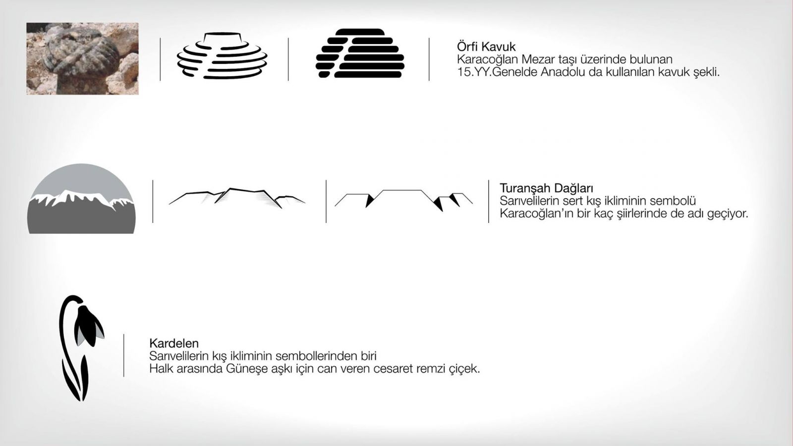 Yeni Logo’da Turanşah Dağları üzerinde yükselen örfi (geleneksel) kavuk formundaki güneş figürü, Karacoğlan’ı temsil etmektedir. Karacoğlan bu toprakların hayat kaynağı olarak güneş gibi yükselirken, Sarıveliler de, bu kaynağa aşık insanların vatanı anlamında güneşe aşık kardelen çiçeğine benzetilmektedir. Turanşah Dağları, Karacoğlan ve Kardelen çiçeği birleşimiyle Sarıveliler kavuşmaların ana vatanı olarak gösterilmektedir.