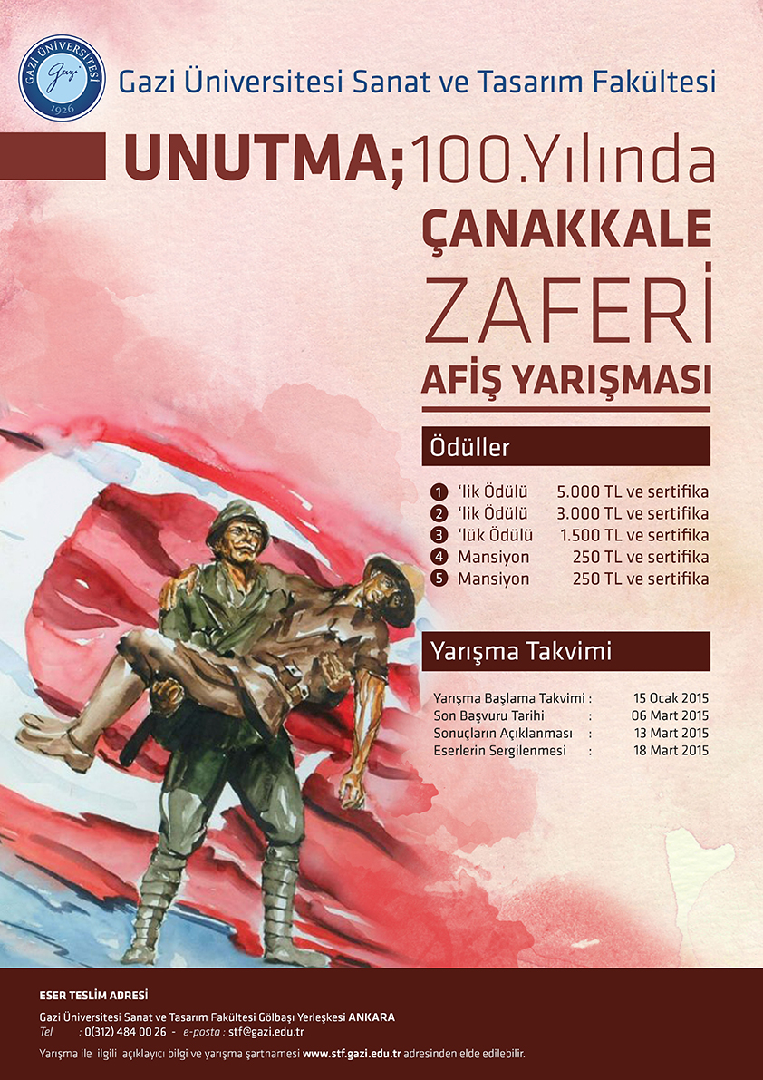 Gazi Üniversitesi Sanat ve Tasarım Fakültesi tarafından Çanakkale Savaşı ve Destanı'nın 100. yılında Çanakkale Zaferi Afiş Tasarım Yarışması düzenliyor.