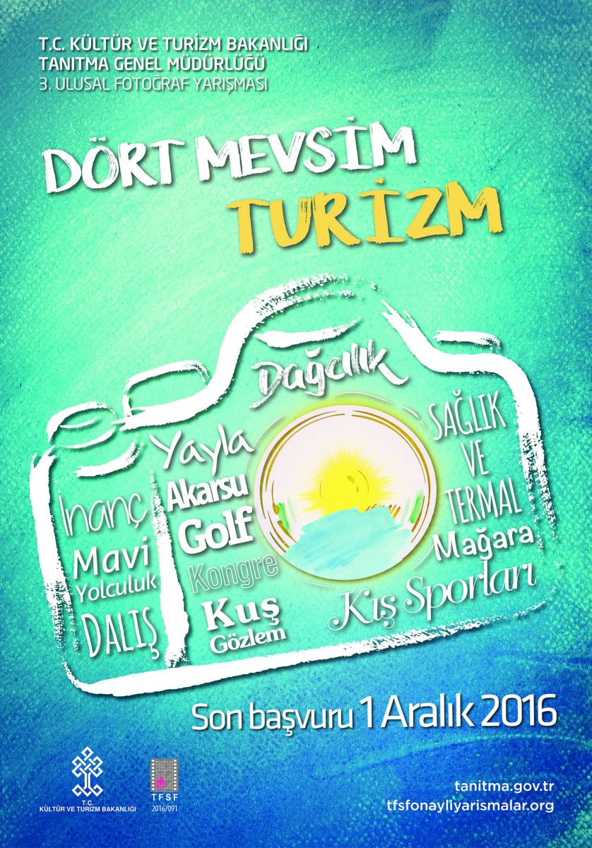 Tanıtma Genel Müdürlüğü tarafından bu yıl üçüncüsü gerçekleştirilecek olan Dört Mevsim Turizm konulu Ulusal Fotoğraf Yarışması için başvurularınızı 01.10.2016 - 01.12.2016 tarihleri arasında online olarak buradan yapabilirsiniz.