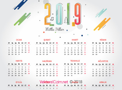 Vektörel 2019 Takvimi Türkçe, Yeni Yıl, Mutlu Yıllar, Ocak, Şubat, Mart, Nisan, Mayıs, Haziran, Temmuz, Ağustos, Eylül, Ekim, Kasım, Aralık, Pazartesi, Salı, Çarşamba, Perşembe, Cuma, Cumartesi, Pazar vektörel görsellerini ücretsiz, üyeliksiz indirebilirsiniz.