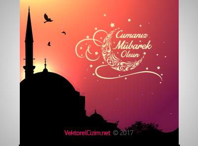 Cumanız Mübarek Olsun, Cami, Minare, Kuşlar, Yıldızlar, Ay Silüeti Hayırlı Cumalar Tebriği vektörel görsellerini ücretsiz, üyeliksiz indirebilirsiniz.
