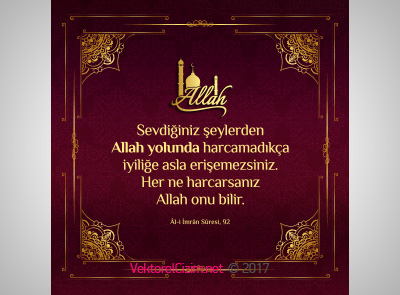 Sevdiğiniz şeylerden Allah yolunda harcamadıkça iyiliğe asla erişemezsiniz. Her ne harcarsanız Allah onu bilir. Âl-i İmrân Sûresi, Hayırlı Cumalar, Bayramlar, Hayırlı Kandiller, Miraç Kandili, Mevlid Kandili, Üç Ayların Başlangıcı Regaip Kandili, Berat Kandiliniz Mübarek Olsun, İslami Tebrik vektörel görsellerini ücretsiz, üyeliksiz indirebilirsiniz.