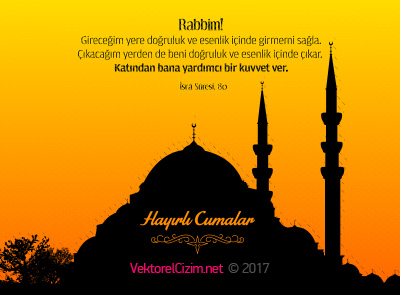 Rabbim! Gireceğim yere doğruluk ve esenlik içinde girmemi sağla. Çıkacağım yerden de beni doğruluk ve esenlik içinde çıkar. Katından bana yardımcı bir kuvvet ver. İsrâ Sûresi, 80, Hayırlı Cumalar, Cumanız Mübarek Olsun, İslam, Ramazan, Cami, Minare, Günbatımı vektörel görsellerini ücretsiz, üyeliksiz indirebilirsiniz.
