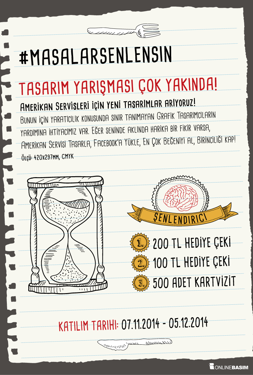 Hazırladığın Amerikan Servis Tasarımlarını (ister bir ya da bir kaç tane) 7 Kasım ile 5 Aralık 2014 tarihler arasında www.facebook.com/onlinebasim profilimizde bulacağın uygulama üzerinden yükleyebileceksin. Amerikan Servis tasarımında renk ve form yönünden bir kısıtlama yoktur.