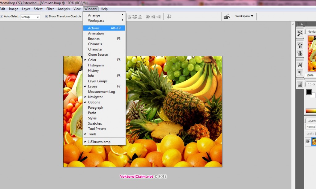 Photoshop’ta Batch, Toplu İşlem Nasıl Uygulanır? Yazısını Görüntülemek İçin Tıklayınız Hemen yeni bir fotoğraf açıp Window penceresinden action panelini seçili hale getirelim.