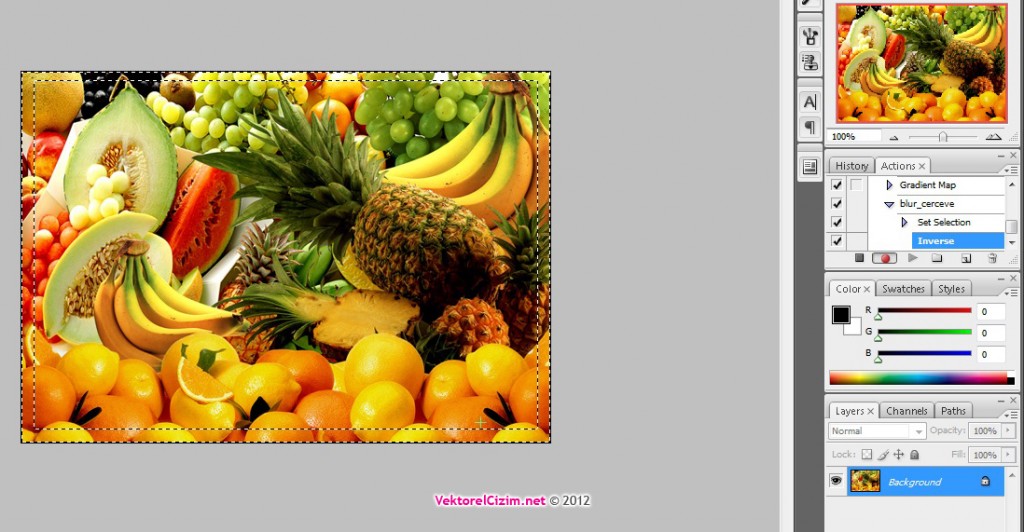 Burda fotoğraflara blur çerçeve vermek istedim, önce çerçeve yapacağımız alanı seçelim. Bunu Marquee Tool (M) aracıyla seçip Ctrl+Shift+I yaparak etrafını seçebiliriz.